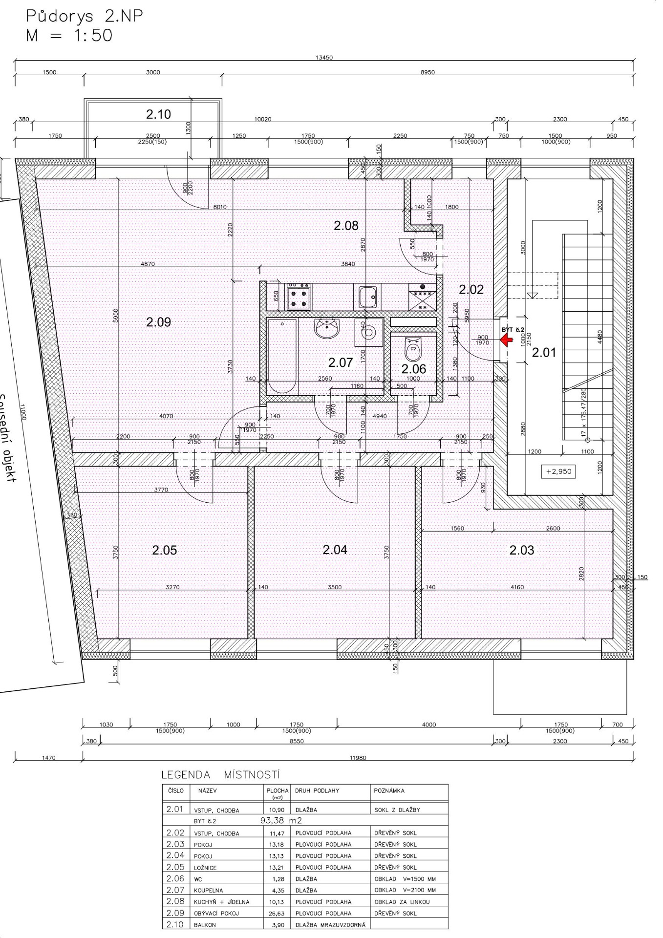 Dispozičně je byt v II. NP navržen tak, že obsahuje vstupní část, ze které jsou přístupné ostatní místnosti v bytě, a to WC, koupelna, obývací pokoj s kuchyní a tři pokoje. V bytě je pak u obývacího pokoje vstup balkon.